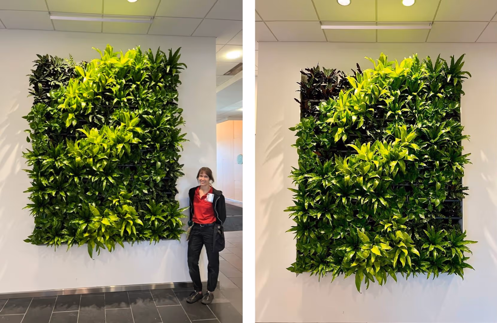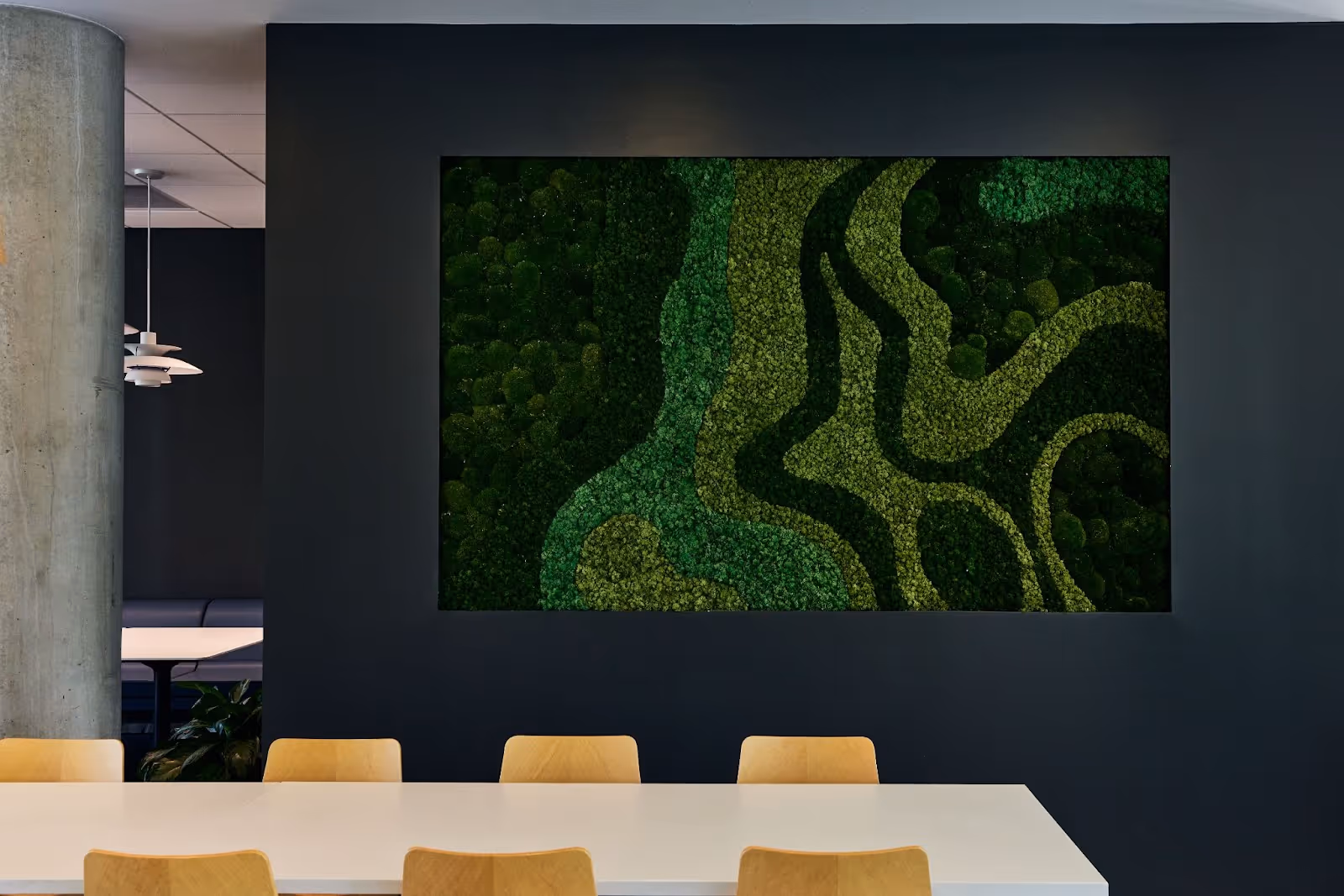 When the plant and moss art design and installations were complete, the plants lent warmth, texture, and softness to previously bland, sterile common spaces in the Coloplast headquarters.