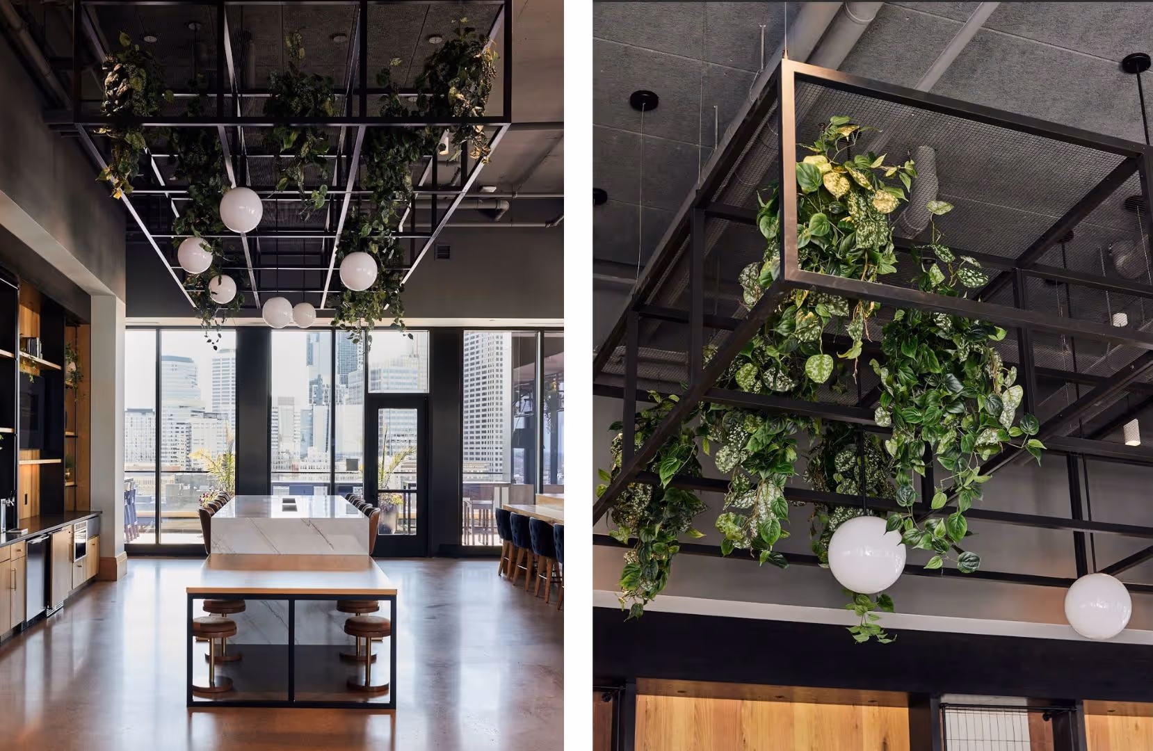 The moss chandelier connects the large, industrial club room on the 18th floor to the green of Target Field, visible from the lobby windows. We designed the kokedama-style moss spheres and foliage—a mix of trailing Scindapsus and Philodendron vines to create the dramatic chandelier effect— and figured out how to attach them to the metal frame.