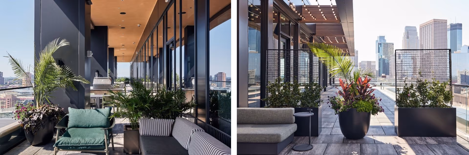 When the buildings were ready, Plants By Design installed plants and design elements in lobbies, lounges, roof decks, pool decks, and terraces across the two buildings.