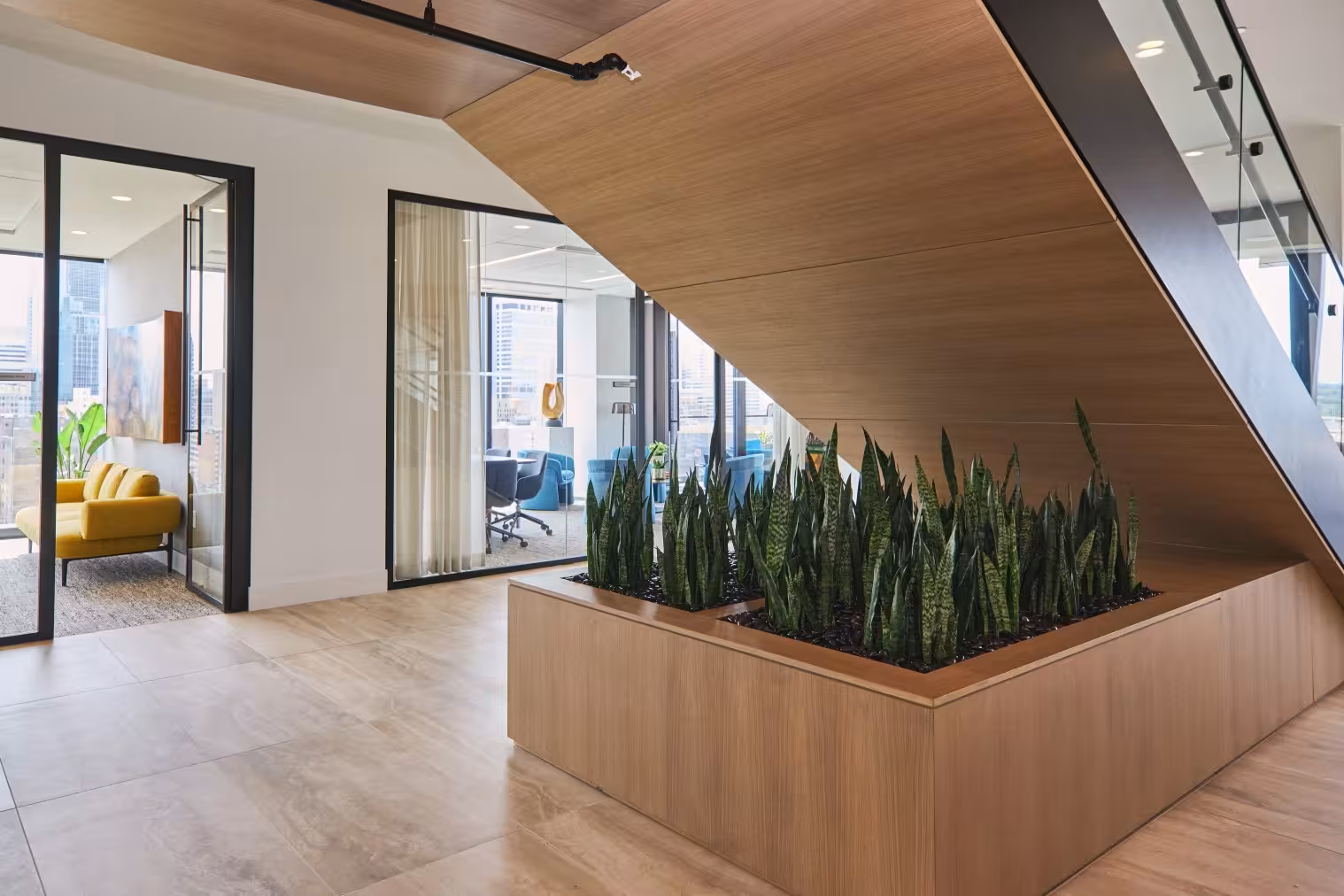 Tall Sansevieria Zeylanica planted in a built-in display beneath the suite’s central staircase provide a sleek, unexpected centerpiece for passersby and for people in the adjacent glass-walled conference room.